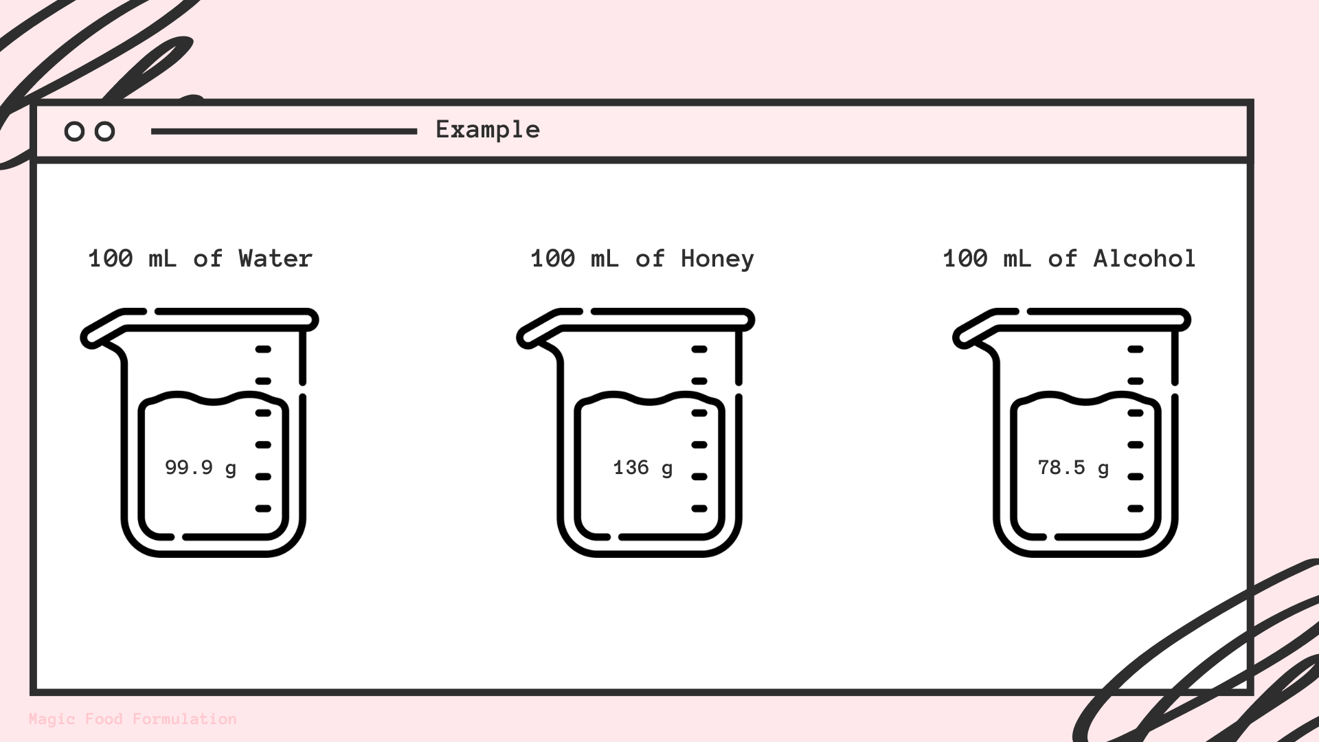 One cup of water in your recipe will not weigh the same as one cup of honey or one cup of coconut oil. This is due to these ingredients having different densities. To calculate density, you take the mass and divide it by the volume.