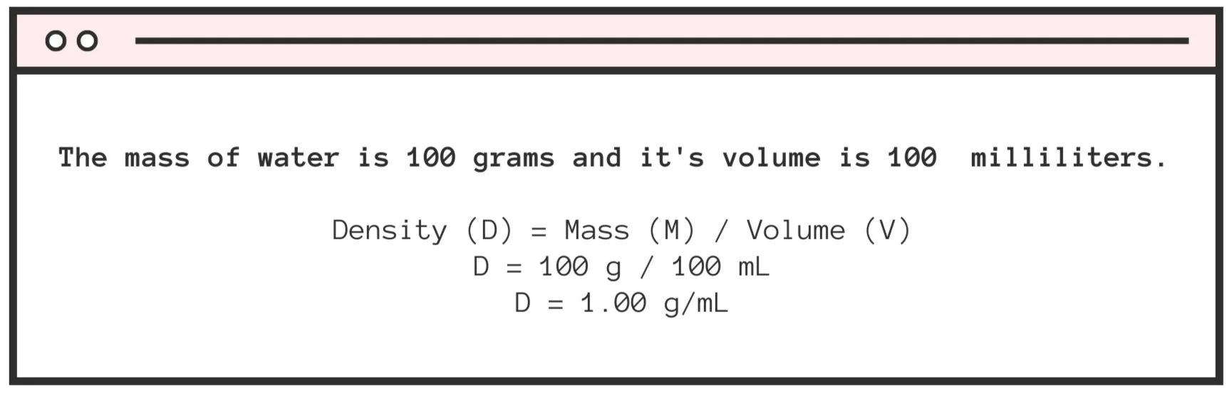 An ingredient’s density is its mass per unit volume. We don’t use volume because every ingredient has a different density. It is a measure of how much “stuff” is in an object in a unit volume (cubic meter or cubic centimeter). Think of it as a measurement of how tightly matter is crammed together.