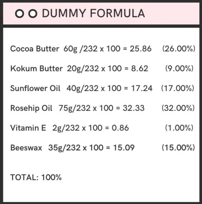 Simply put, 1% is equivalent to 1g, 5% is equivalent to 5g. In all cases 100g is the same as 100%. If you want to make double the amount you would multiply each ingredient by two. If you want to make 300g you would multiply by three and so on. If you wanted to scale up the above formula to 250g then it is easy. You will simply multiply each ingredient by 2.5 as below:Cocoa Butter 26.00 x 2.5 = 65g