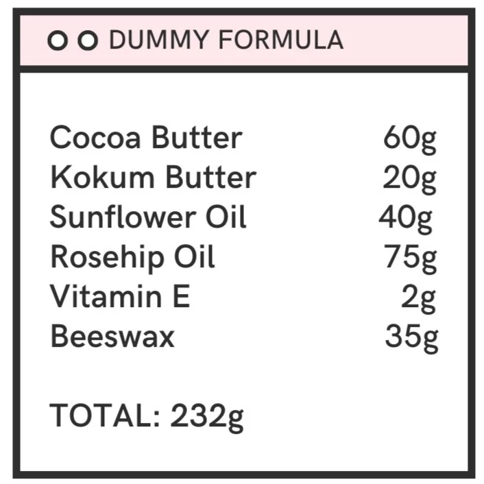 Once you have finished calculating the percentages you will then have to make the formula again following the your calculations. The formula isn’t likely to be perfect but you will have a starting point. I like to use an excel spreadsheet to do this but it is possible to calculate manually, in fact that is how I started. Using this approach is ideal for anhydrous products but can be applied to other types of formulation. The key is to ensure that you know your ingredients well and read the data sheets of potent ingredients such as preservatives and fragrances and use your knowledge to decide the safest way to proceed.